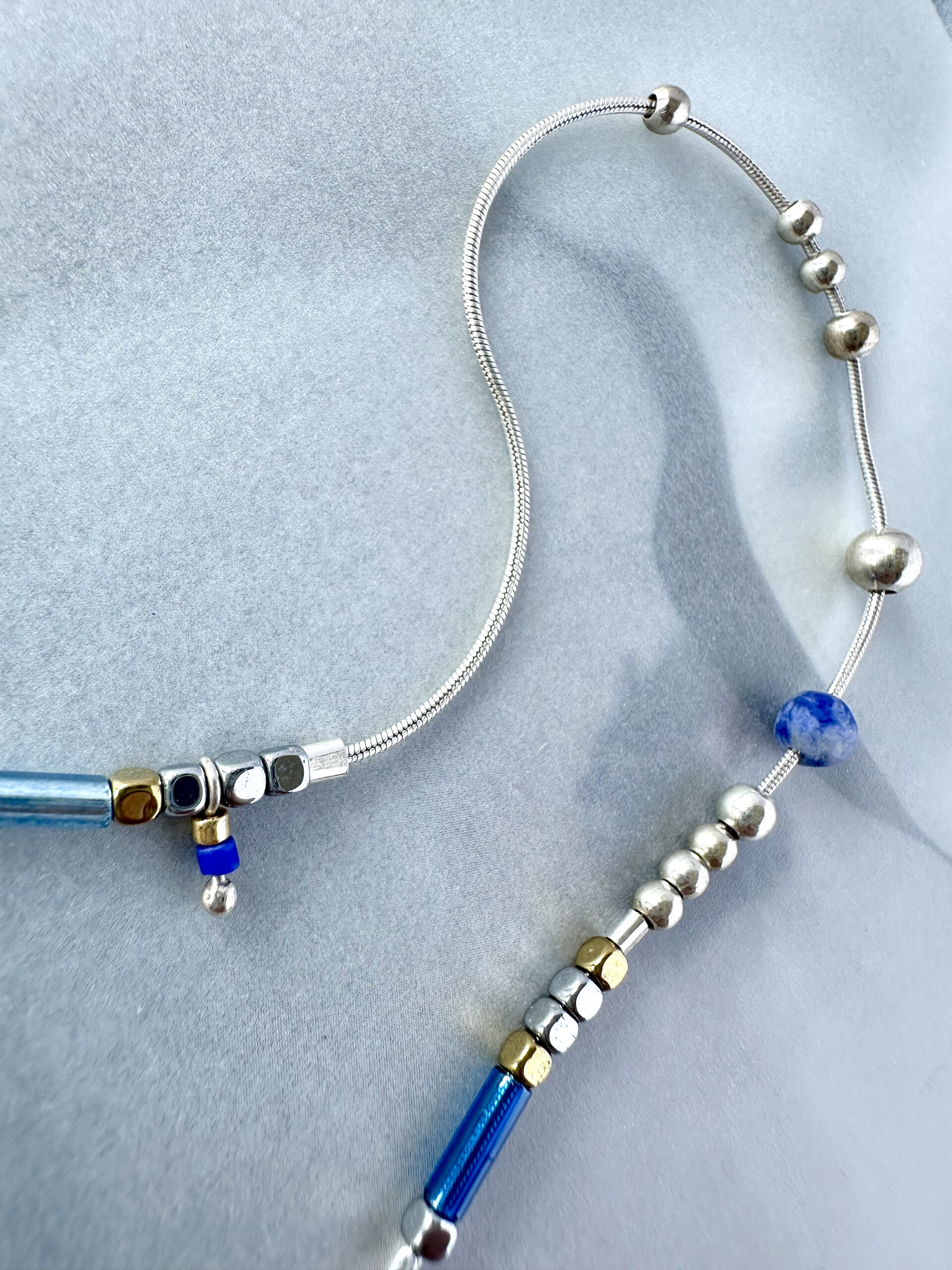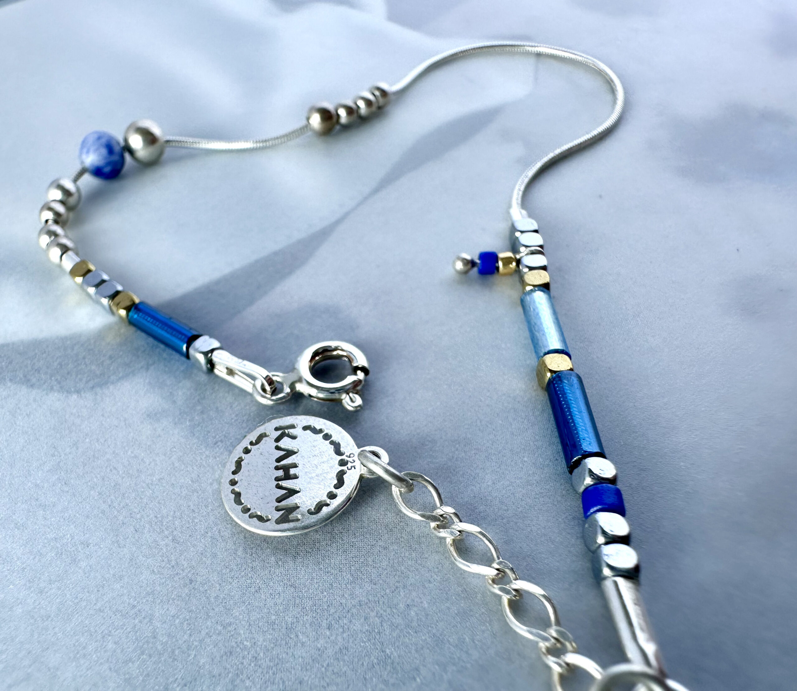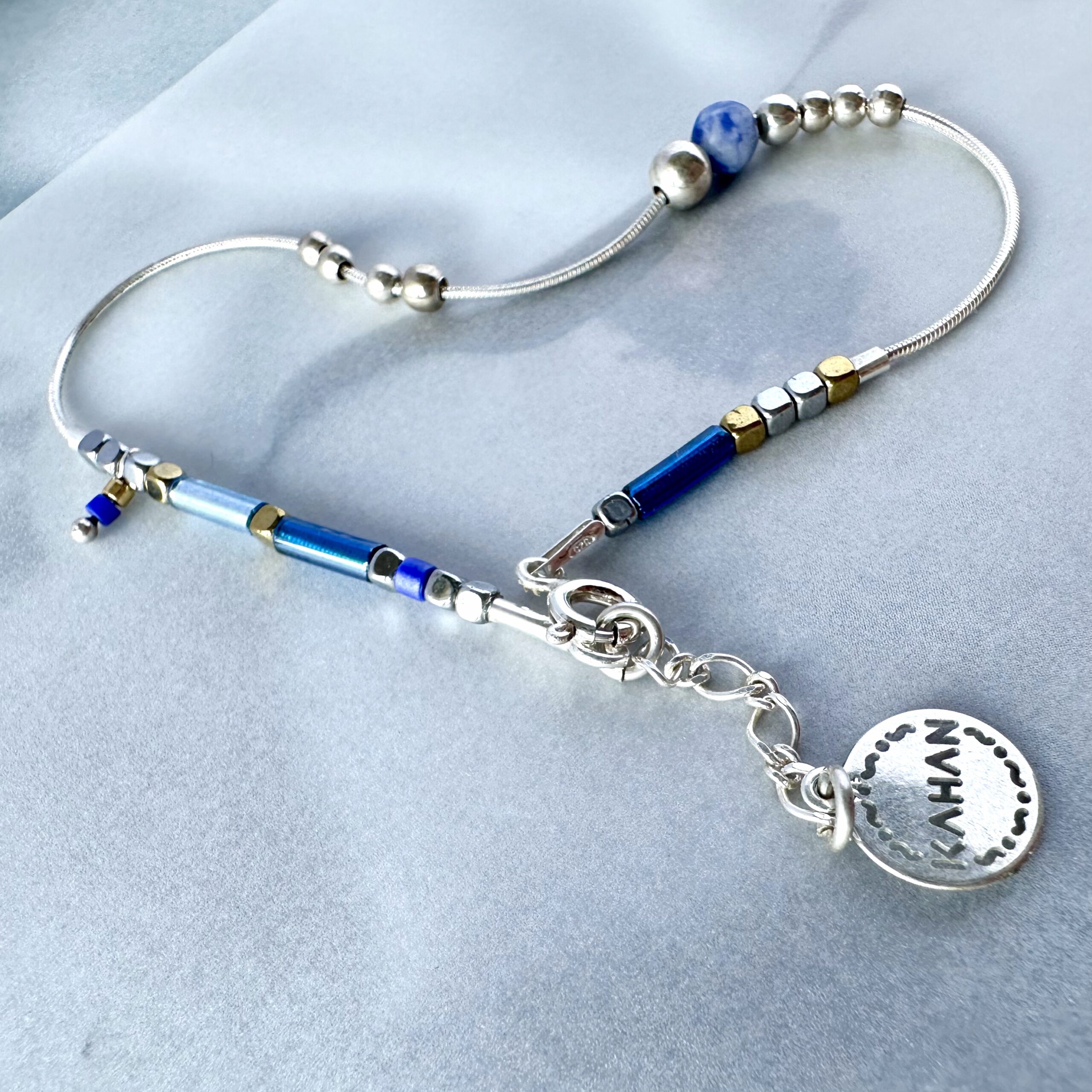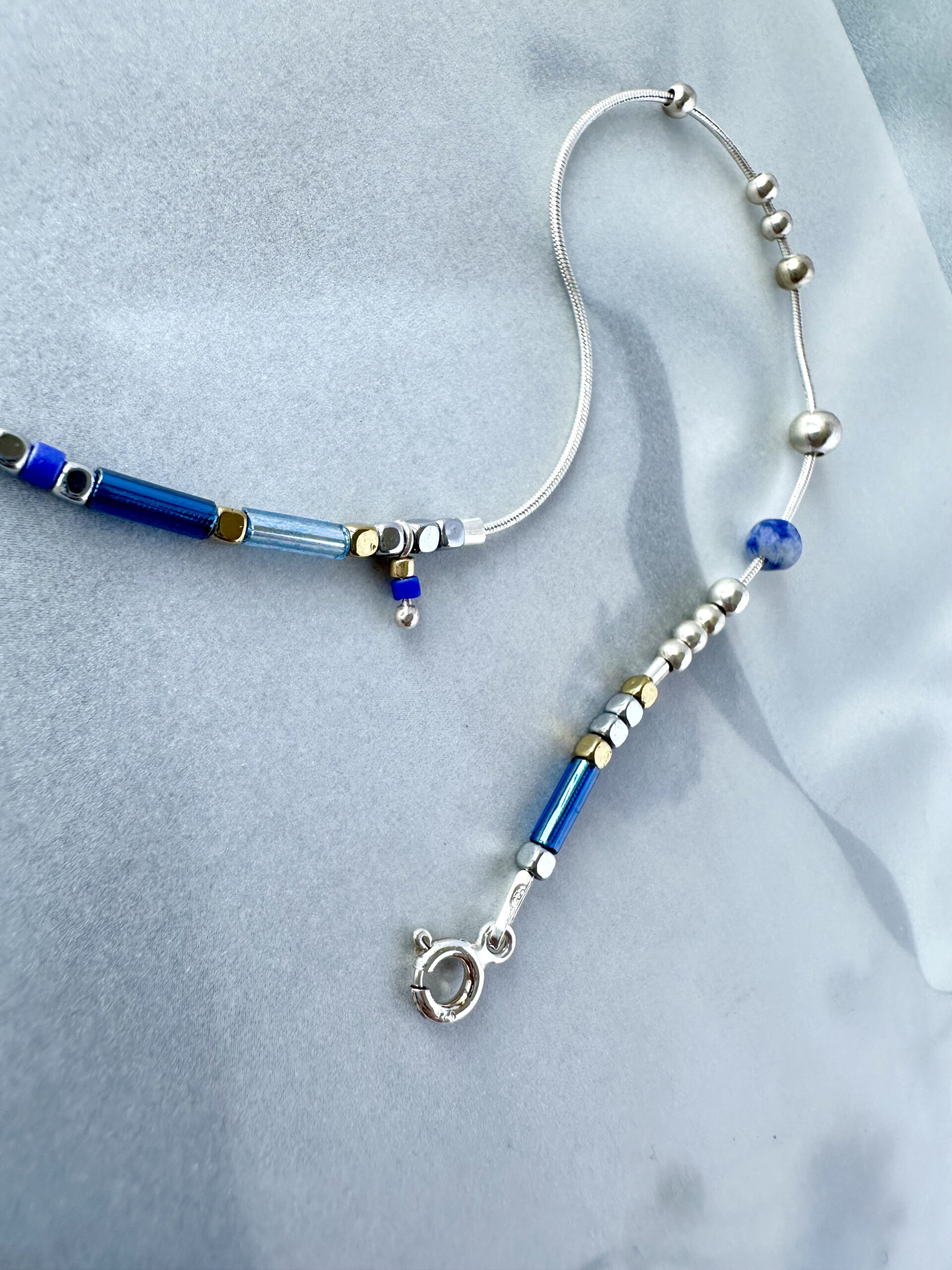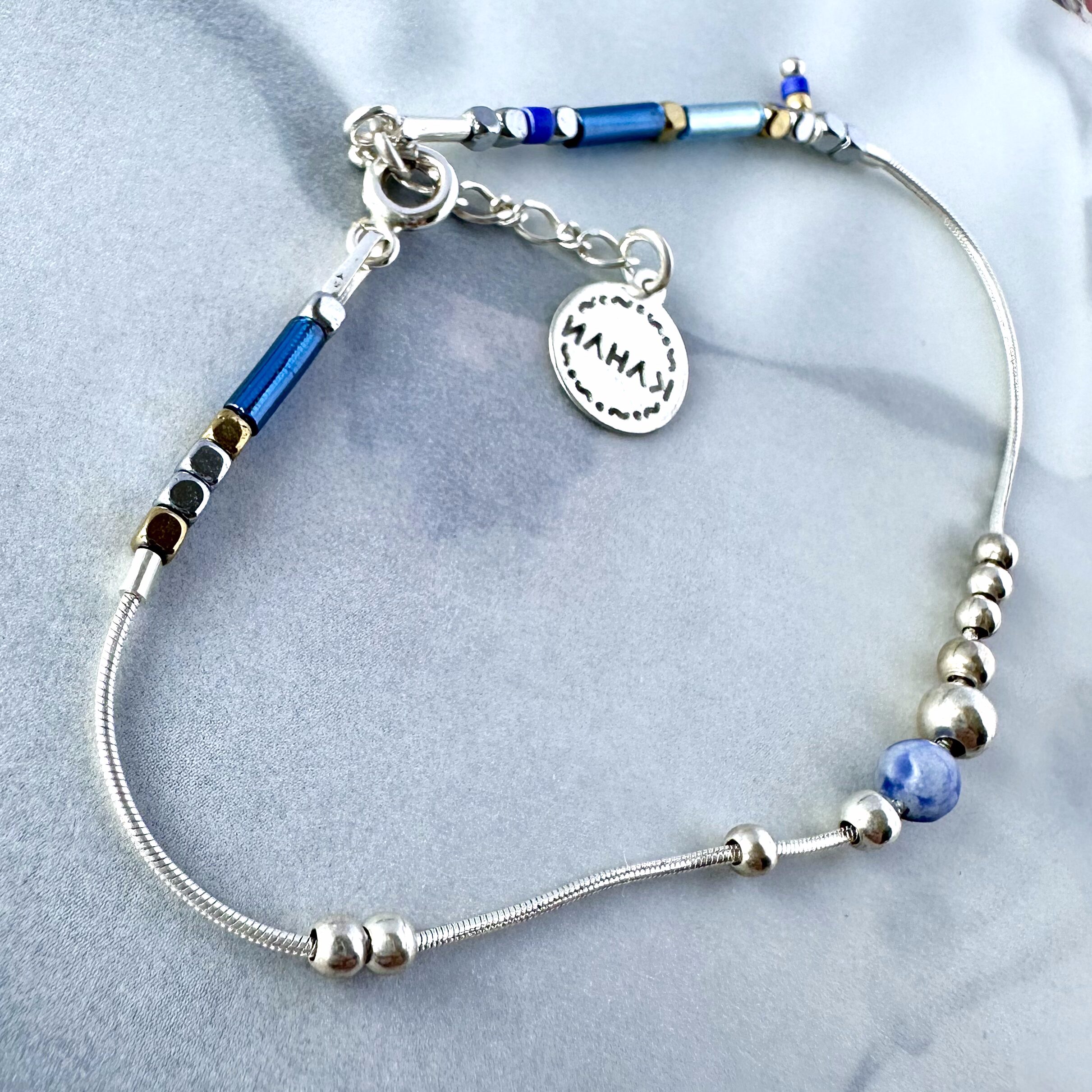 Náramek Snake Chain je celostříbrný šperk s hematity, stříbrnými korálky, japonským rokajlem, 6mm buggles Miyuki a 4mm broušeným minerálem lapis lazuli. Šperk má neotřelý a hravý design, komponenty volně kloužou na kulatém hladkém hadím řetízku, takže náramek na ruce působí velmi živě. Je dozdoben stříbrným nýtem s rokajlem.