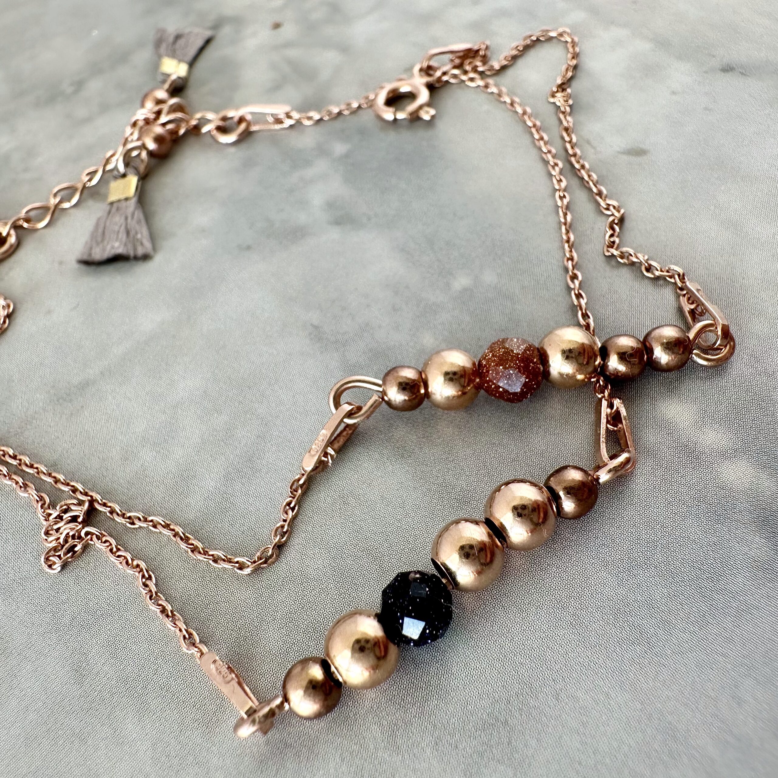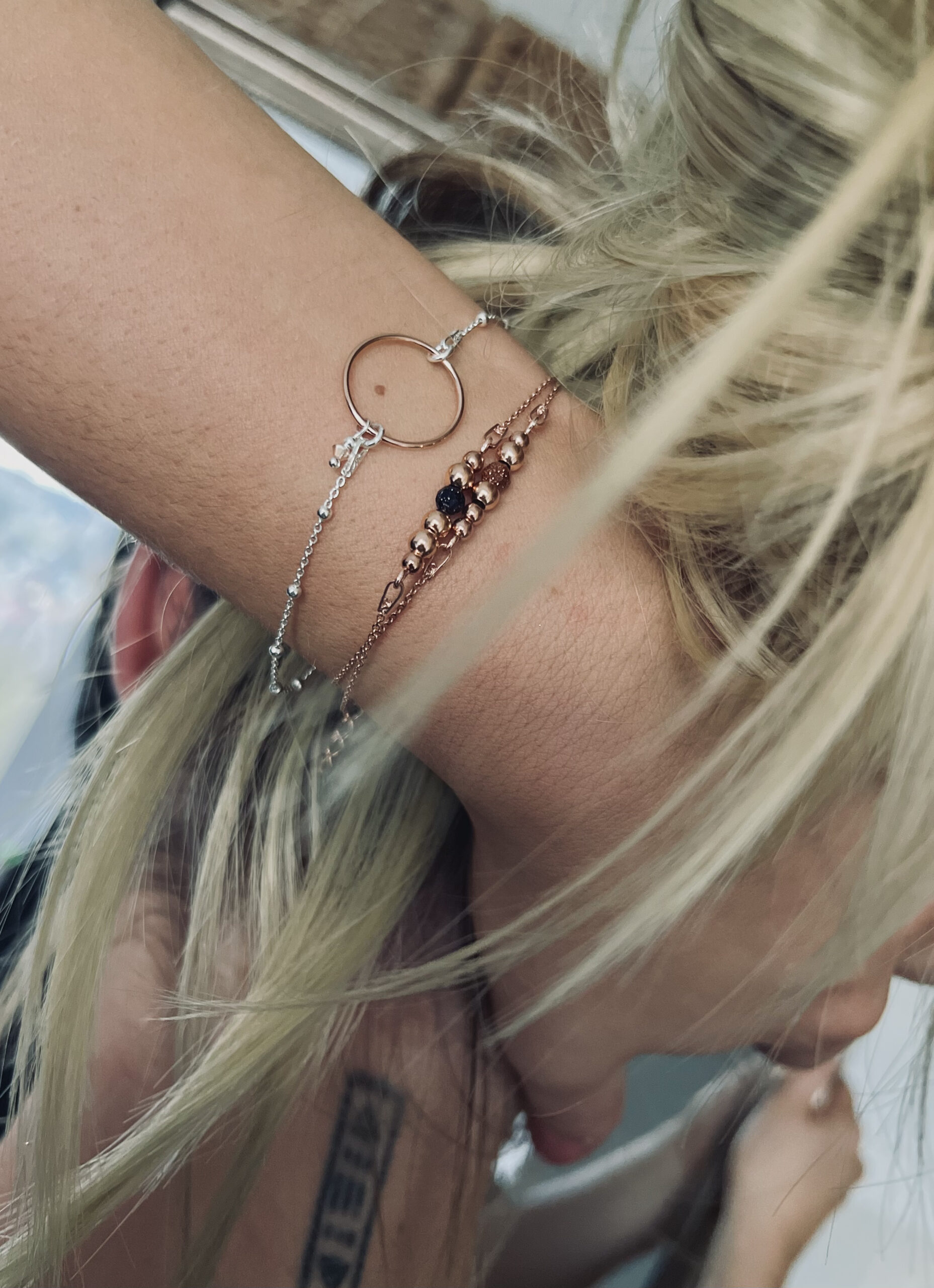 Jemný stříbrný náramek zlacený růžovým zlatem se modrým avanturínem. Díky prodlužovacímu řetízku si můžete velikost snadno upravit. Je zakončený ručně vyrobeným střapečkem ze 100% hedvábí. Náramek patří do kolekce Stars a je velmi dobře kombinovatelný i s ostatními náramky.
