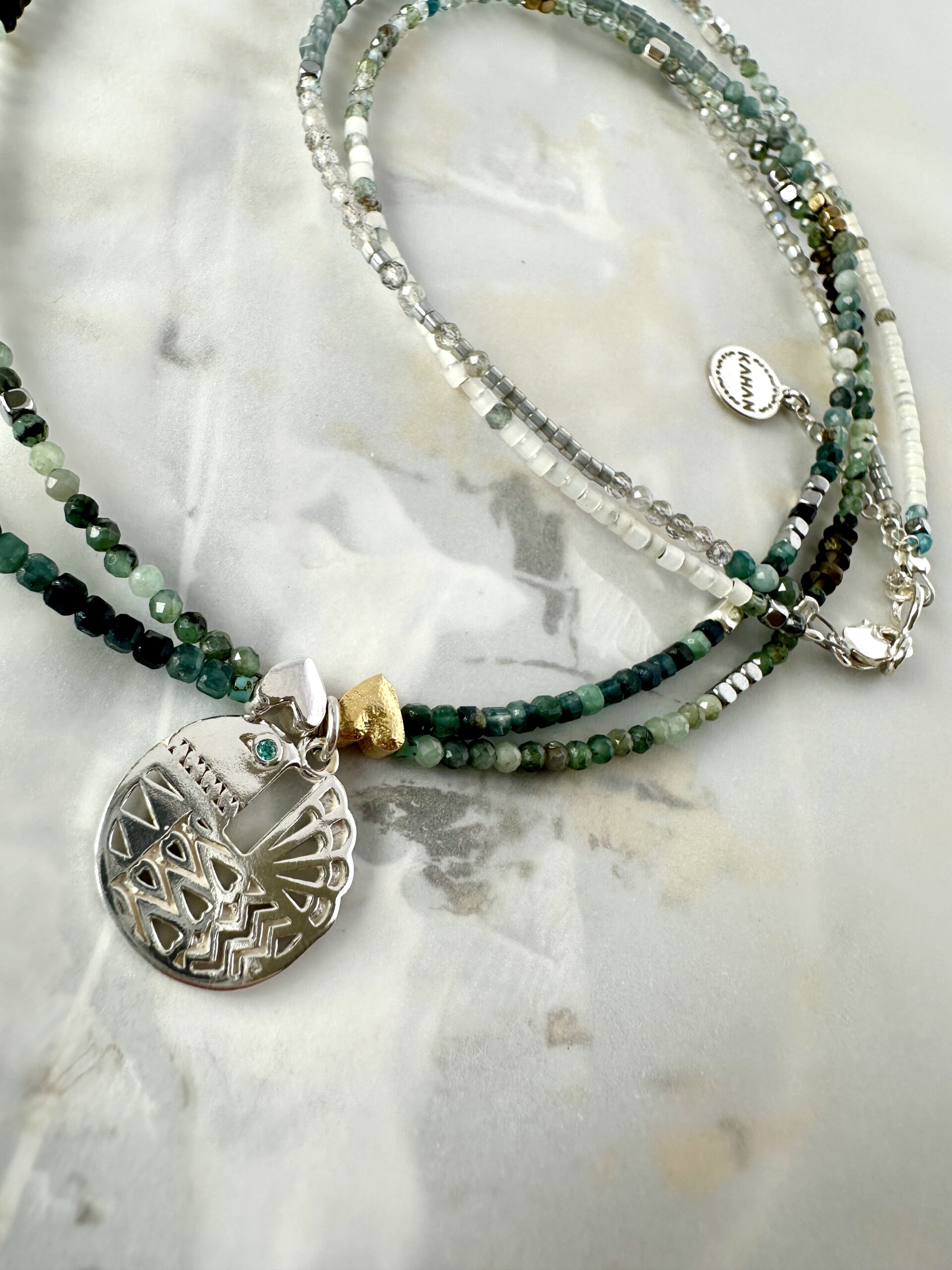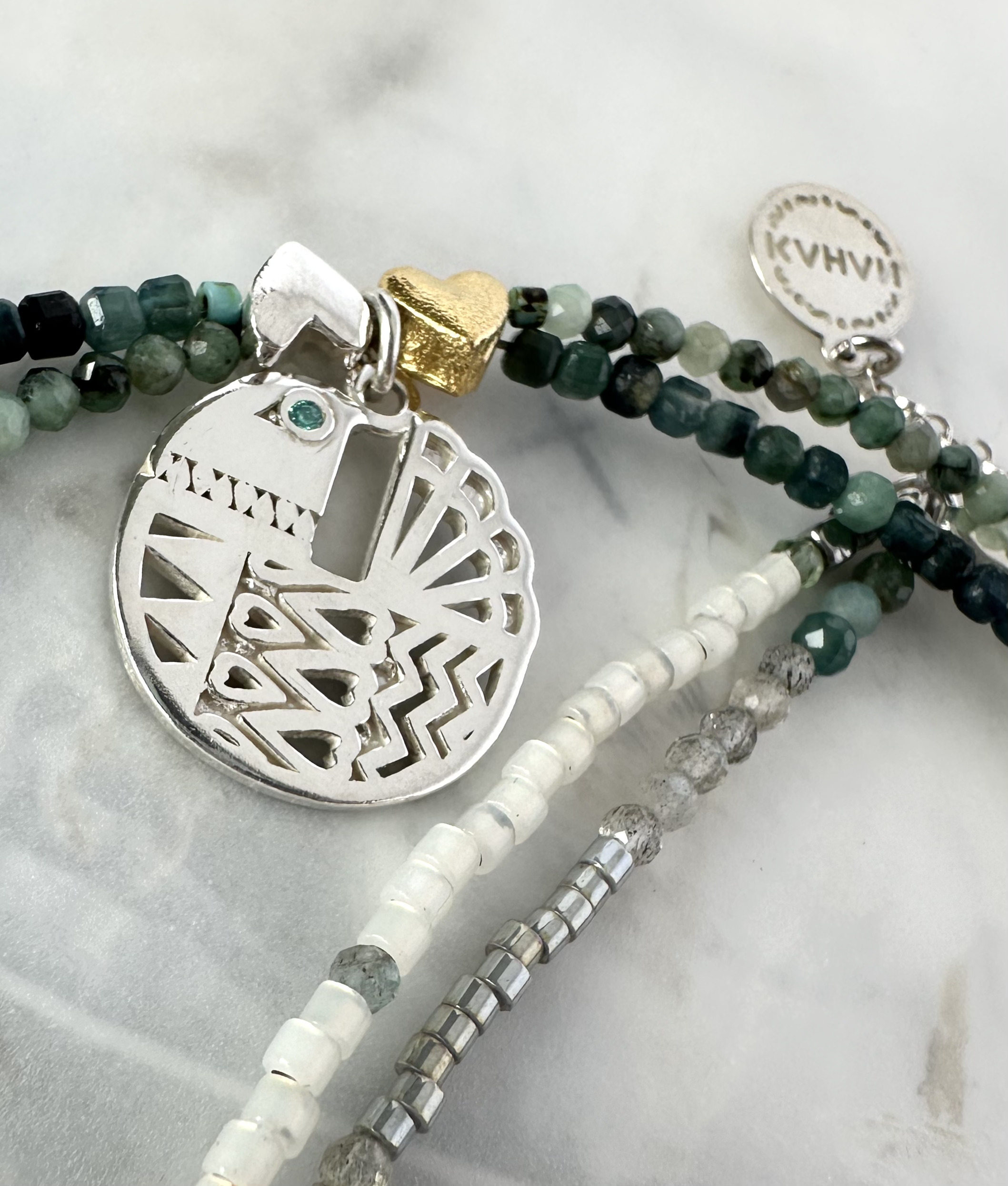 Originální autorský design z dílny KAHAN představuje dvojici holoubků, Eskila a Desiderii, které patří k sobě. Zdobí je pestrá směs broušených polodrahokamů, jako jsou kulaté a čtvercové smaragdy (2,5 mm), zlatý obsidián, labradority a hematity. Šperky jsou dále dozdobené stříbrnými i zlacenými aplikacemi a japonským rokajlem Miyuki. Do oček obou holoubků jsou ručně vsazené modré zirkony Swarovski.