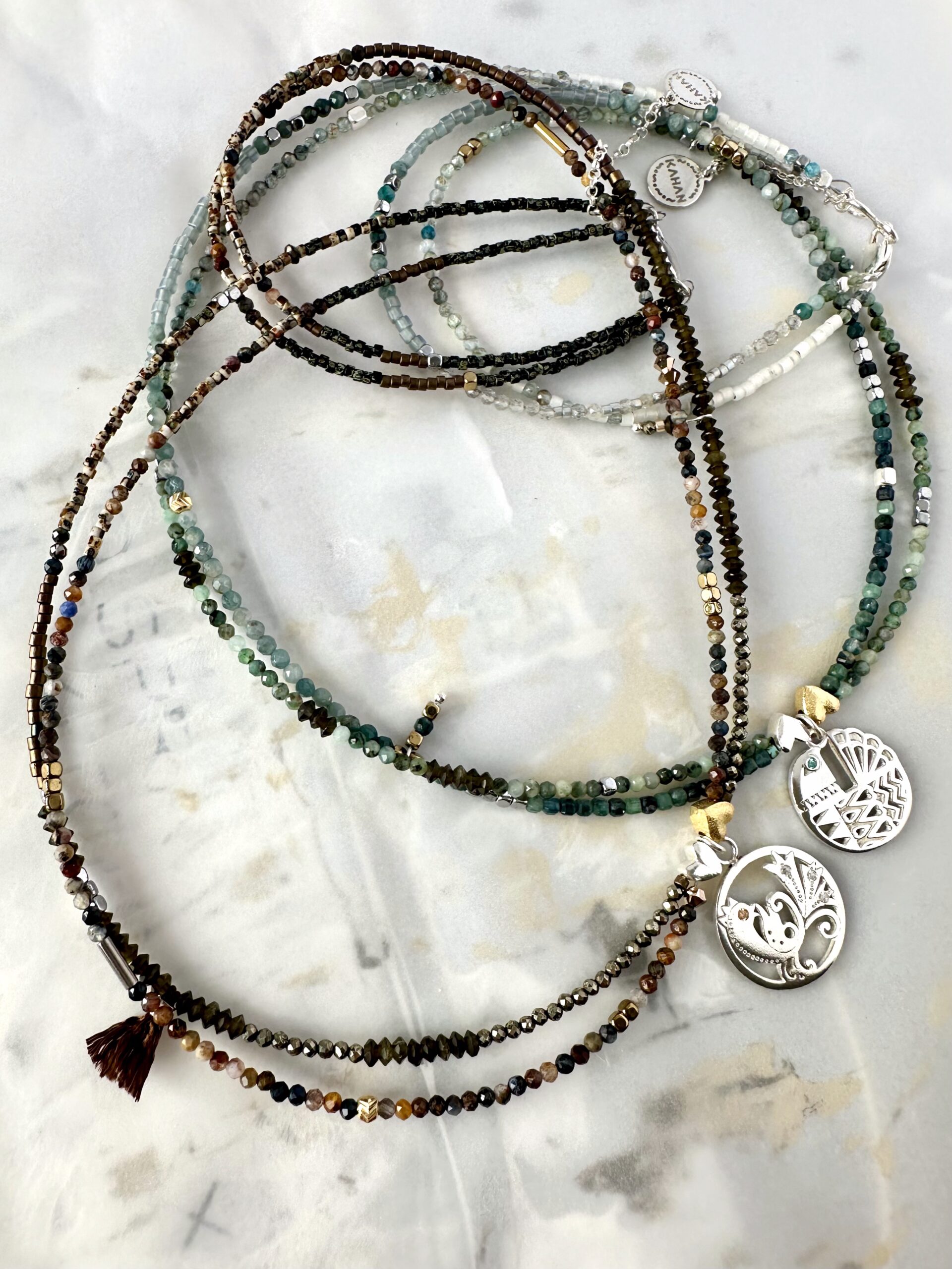 Oba šperky zdobí stříbrné nýty s hematitem a smaragdy. Závěr je doplněn logem značky Kahan.