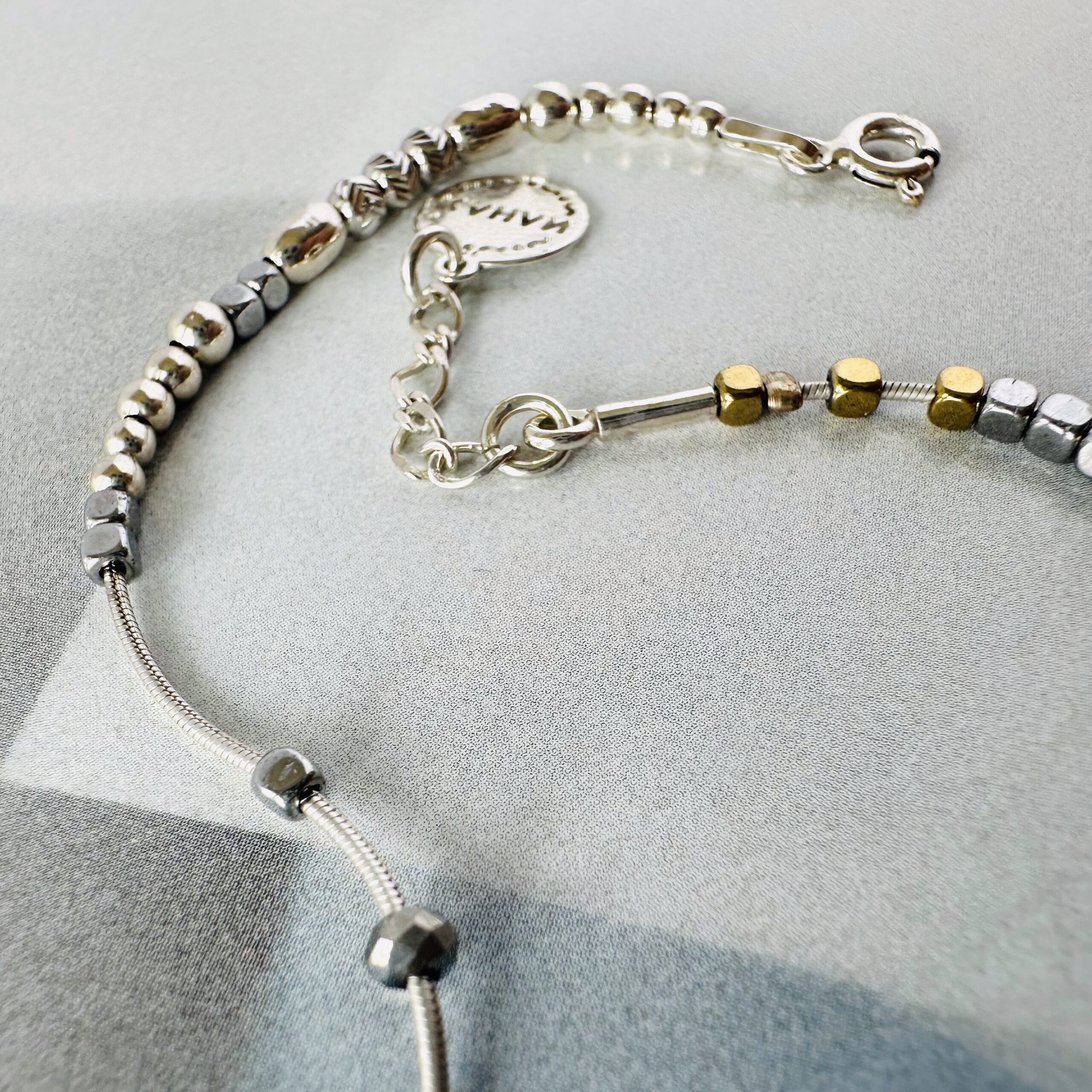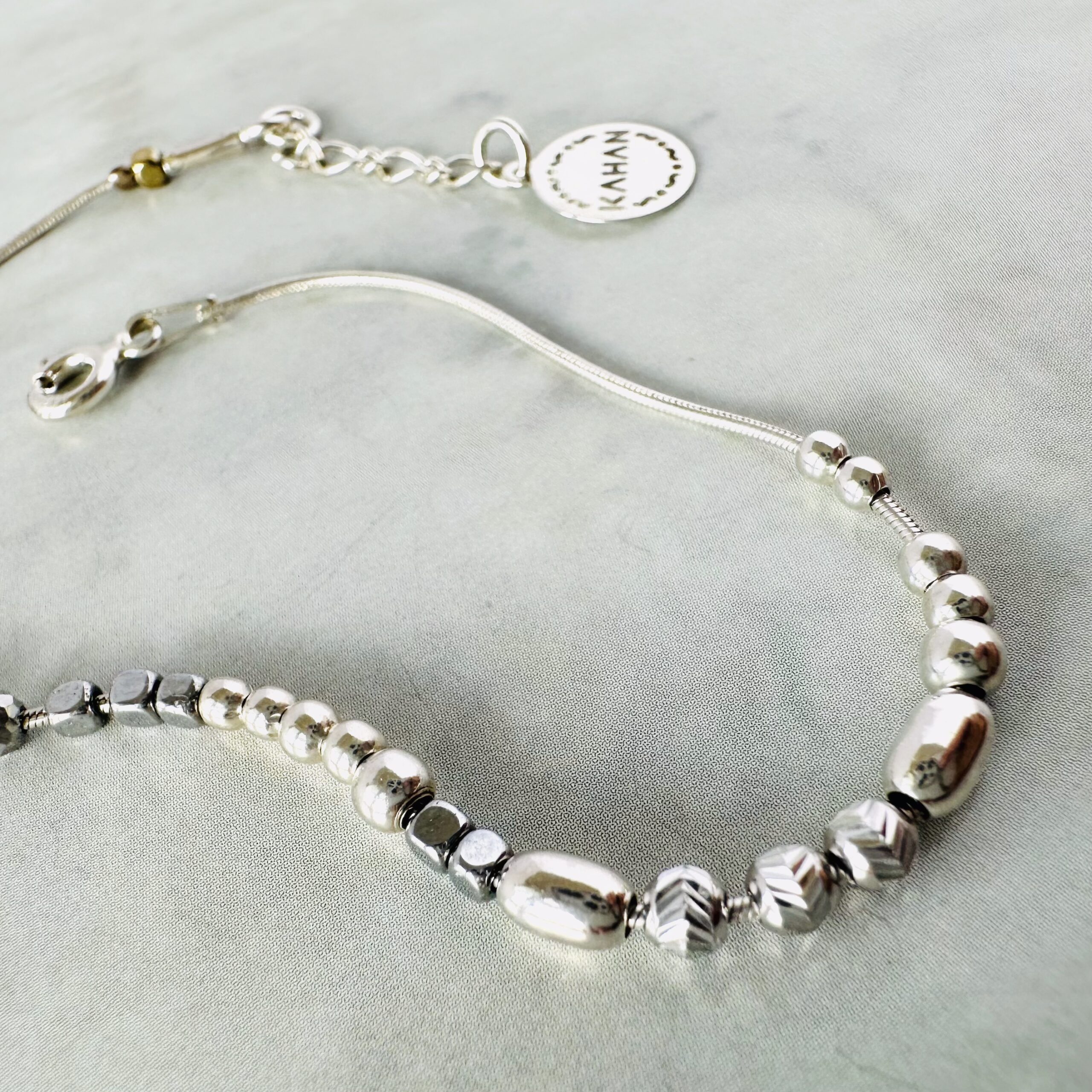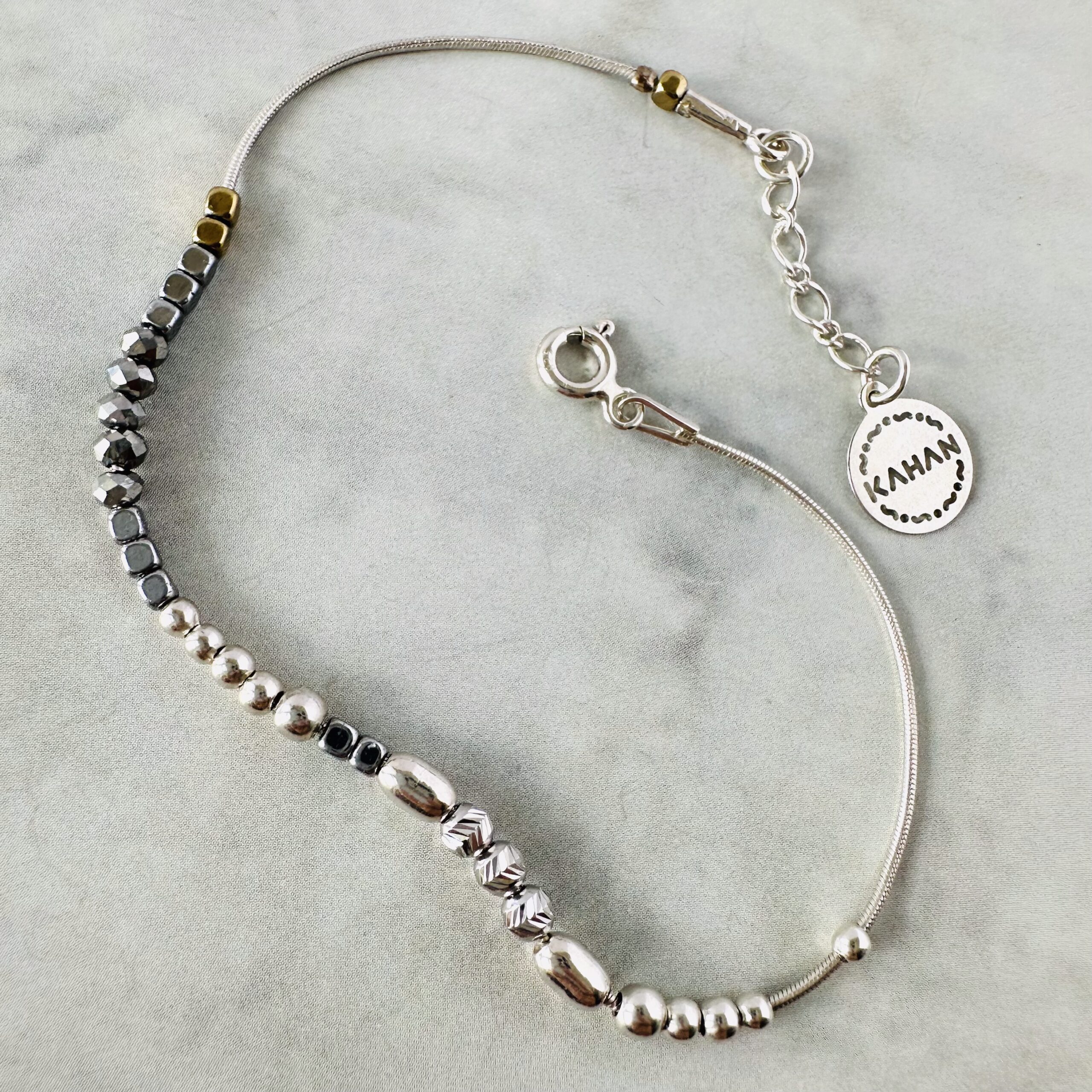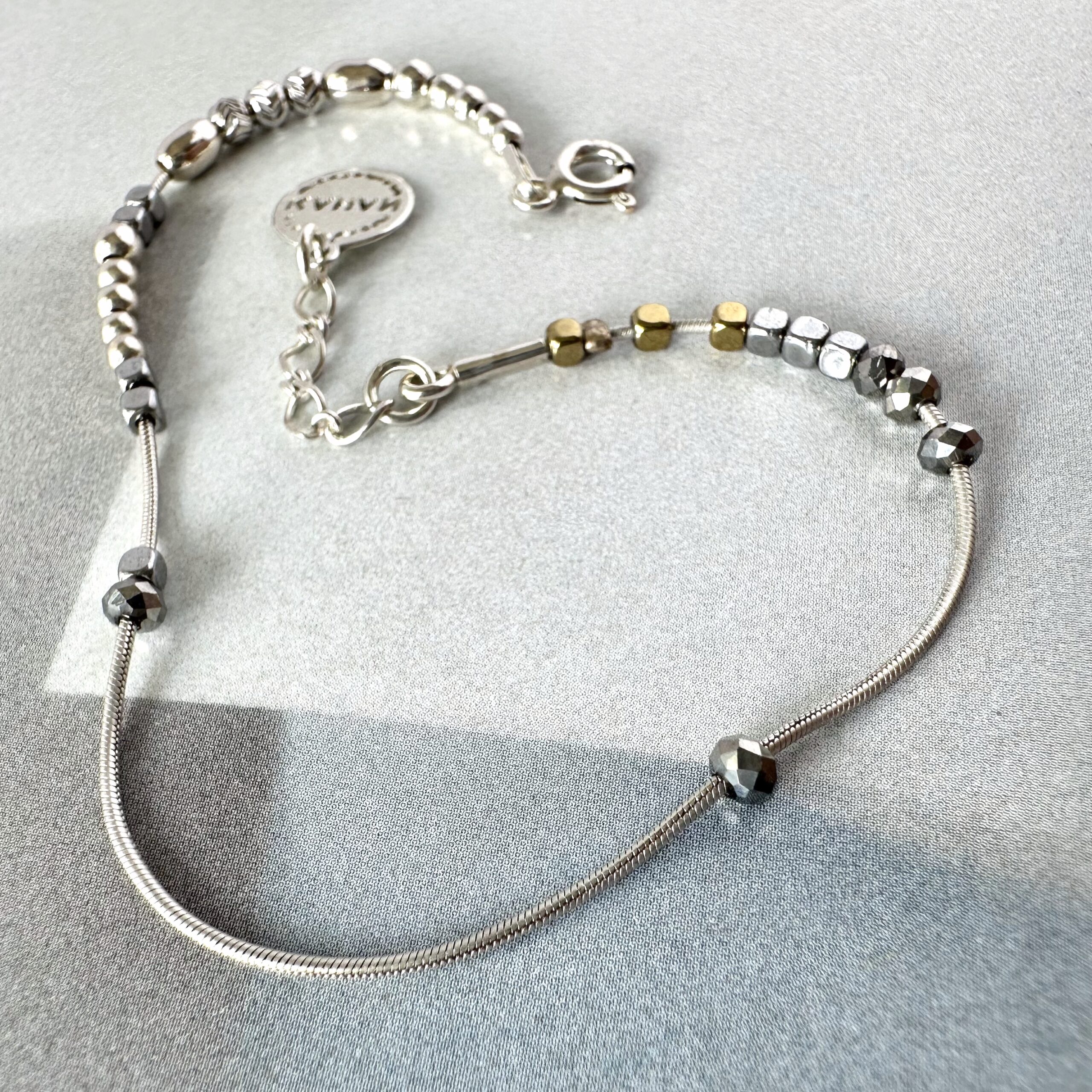Náramek Snake Chain je celostříbrný šperk s hematity a stříbrnými korálky. Šperk má neotřelý a hravý design, komponenty volně kloužou na kulatém hladkém hadím řetízku, takže náramek na ruce působí velmi živě