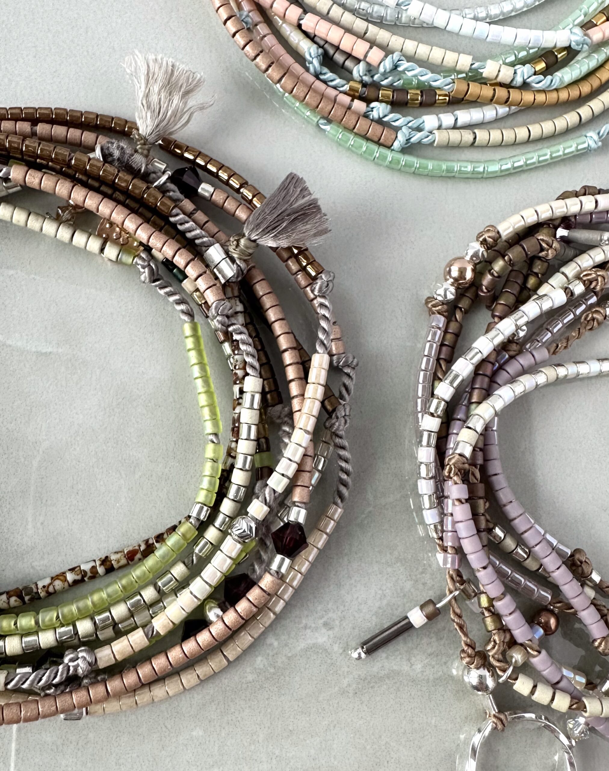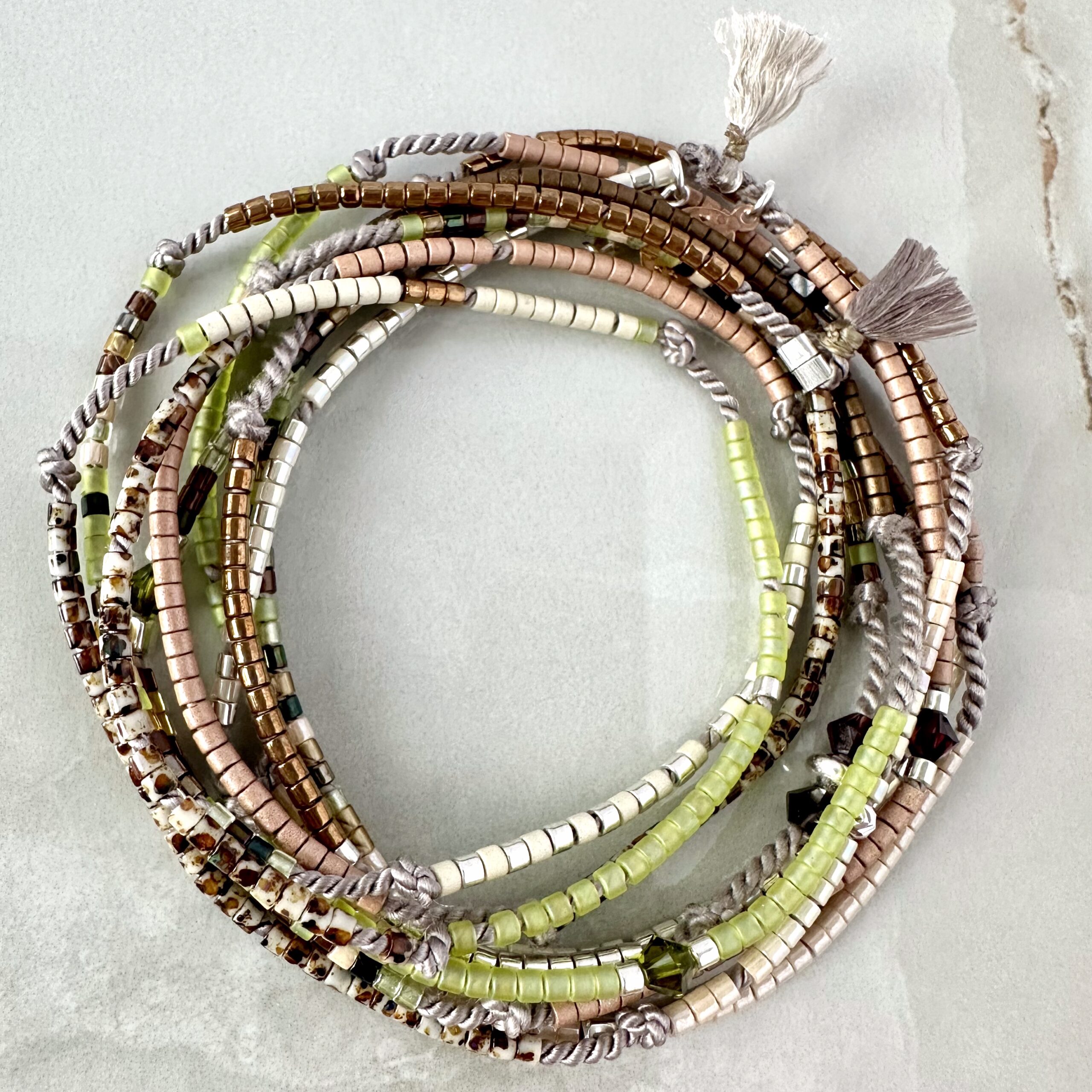 Velice zajímavě řešený náhrdelník/náramek na pevné hedvábné niti s japonským rokajlem Miyuki a stříbrnými aplikacemi. Náramek je navlékací a maximálně dlouhý, nemá tím pádem možnost regulace délky, více ho tedy doporučujeme jako náhrdelník. Kolem krku lze omotat na několikrát. Barva nitě je naturálně šedá.